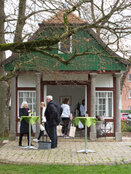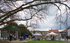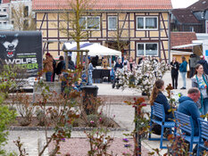 Deutlich größer als normal fiel der Wochenmarkt am Nachmittag des 14. April 2023 aus. Viele Verkaufs- und Imbiss-Stände verteilten sich rund ums Rathaus im Bürgerpark und auf der Schmiedewiese zum Frühlings-Spektakel. Dazu gab es Live-Unterhaltung von der Göttinger Coverband Rock Wave.