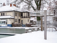 Das Wasser bleibt über den Winter im Becken. Da Reinigung und Pumpen abgeschaltet sind, sammeln sich schnell Laub und Algen im Wasser. Zwei Monate nach dem Saison-Ende sind die Bäume – in diesem Jahr (2023) recht spät – bunt gefärbt und das Wasser intensiv grün.