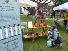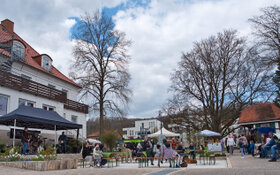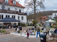 Deutlich größer als normal fiel der Wochenmarkt am Nachmittag des 14. April 2023 aus. Viele Verkaufs- und Imbiss-Stände verteilten sich rund ums Rathaus im Bürgerpark und auf der Schmiedewiese zum Frühlings-Spektakel. Dazu gab es Live-Unterhaltung von der Göttinger Coverband Rock Wave.