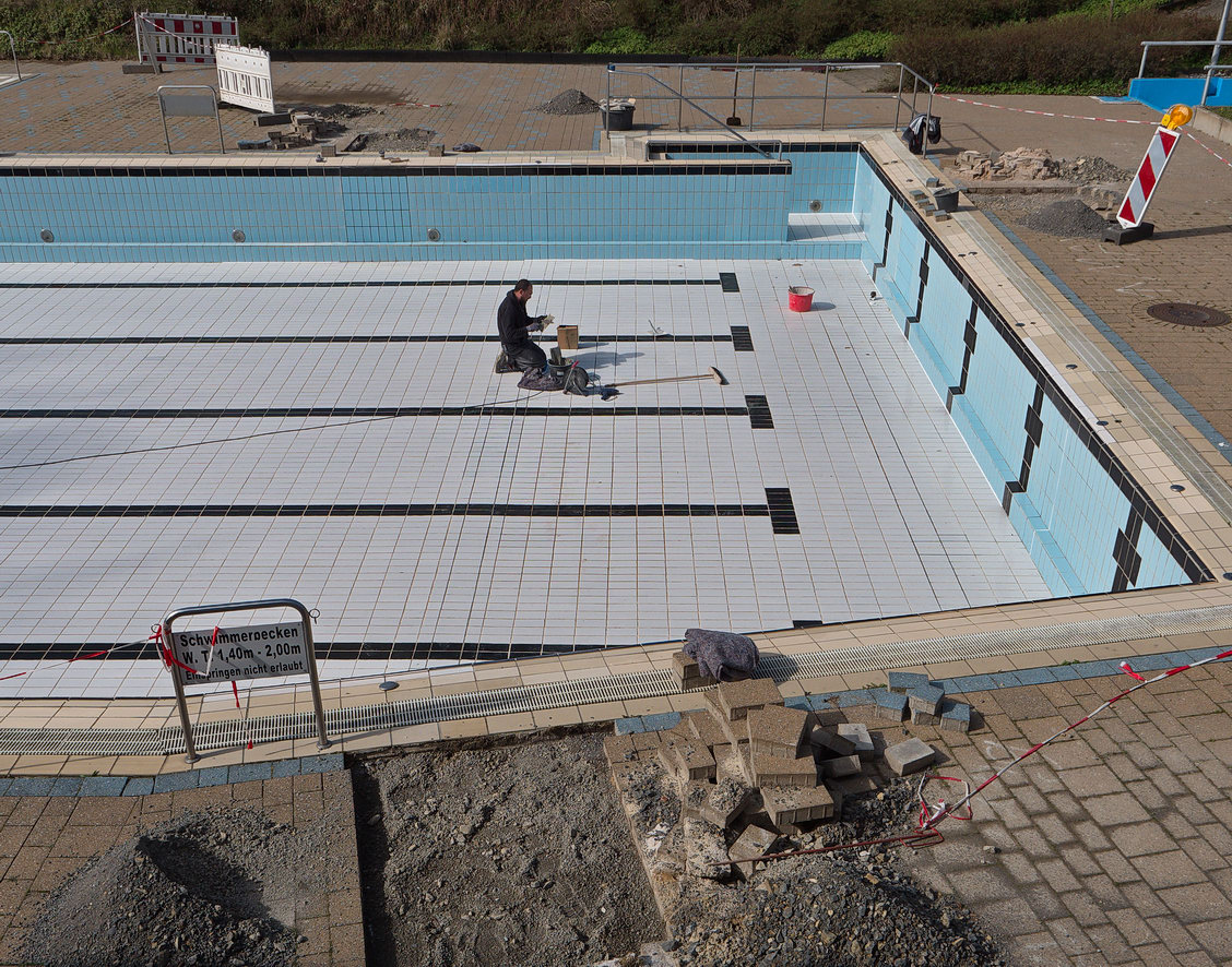 Auch 2023 musste vor der Eröffnung des Schwimmbades allerlei erledigt werden. Für den Austausch etlicher Becken-Fliesen kam ein gewerblicher Fachbetrieb – das Schwimmbad glich kurzzeitig einer großen Baustelle –, viele andere Arbeiten wurden wieder von den Ehrenamtlichen des Fördervereins übernommen.
