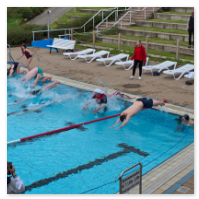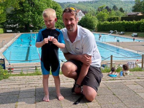 Am 21. Mai konnten Kinder und Jugendliche beim Schwimmmeister Sascha Weidhüner die Prüfungen für diverse Schwimmabzeichen ablegen. Die Schwimmer für das Totenkopf-Abzeichen mussten u. a. zwei Stunden ohne Pause schwimmen (linke Bildergruppe), was sie aber alle schafften. Auf dem rechten Foto präsentiert der jüngste Teilnehmer stolz sein frisch erworbenes Seepferdchen.