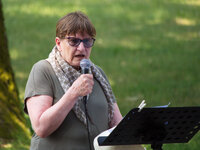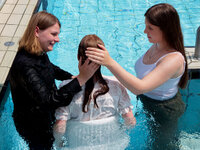 Am Sonntag wurde dann zunächst – mit musikalischer Begleitung durch die Kirchen-Band – unter den Bäumen des Burgbades ein Gottesdienst abgehalten. Danach wurde zum Schwimmbecken gewechselt, wo Pastorin Anne Dill mit jedem der drei Täuflinge ins Wasser hinab stieg und die eigentliche Tauf-Zeremonie abhielt.